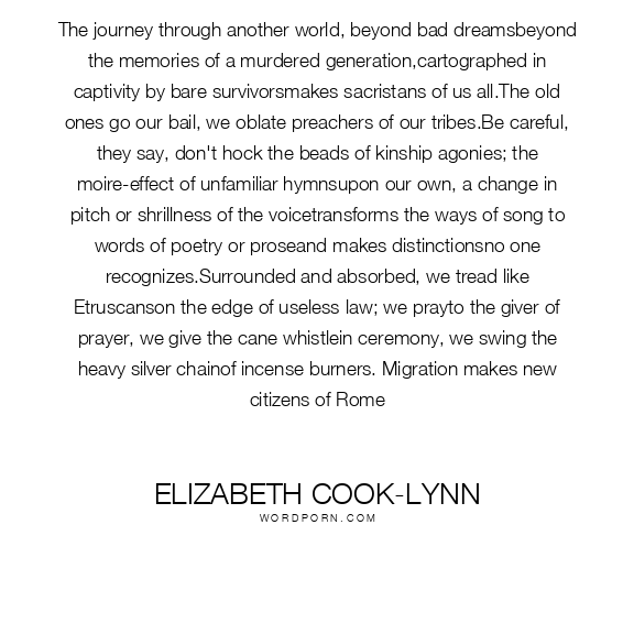 The journey through another world, beyond bad dreamsbeyond the memories of a murdered generation,cartographed in captivity by bare survivorsmakes sacristans of us all.The old ones go our bail, we oblate preachers of our tribes.Be careful, they say, don't hock the beads of kinship agonies; the moire-effect of unfamiliar hymnsupon our own, a change in pitch or shrillness of the voicetransforms the ways of song to words of poetry or proseand makes distinctionsno one recognizes.Surrounded and absorbed, we tread like Etruscanson the edge of useless law; we prayto the giver of prayer, we give the cane whistlein ceremony, we swing the heavy silver chainof incense burners. Migration makes new citizens of Rome