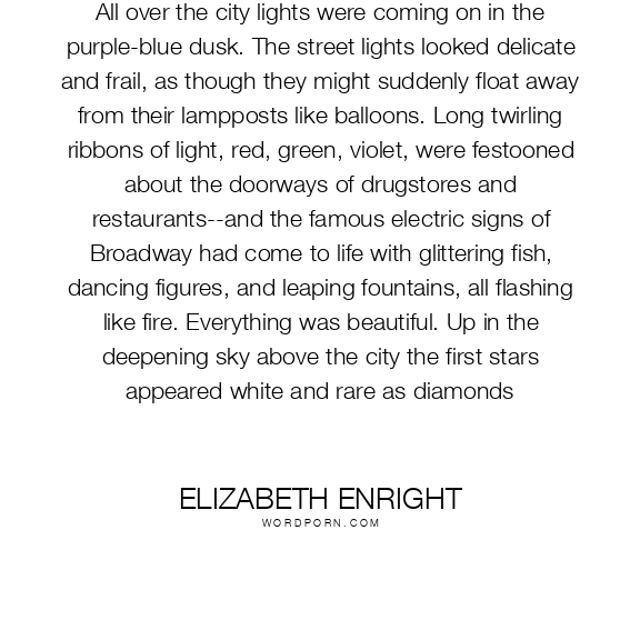 All over the city lights were coming on in the purple-blue dusk. The street lights looked delicate and frail, as though they might suddenly float away from their lampposts like balloons. Long twirling ribbons of light, red, green, violet, were festooned about the doorways of drugstores and restaurants--and the famous electric signs of Broadway had come to life with glittering fish, dancing figures, and leaping fountains, all flashing like fire. Everything was beautiful. Up in the deepening sky above the city the first stars appeared white and rare as diamonds