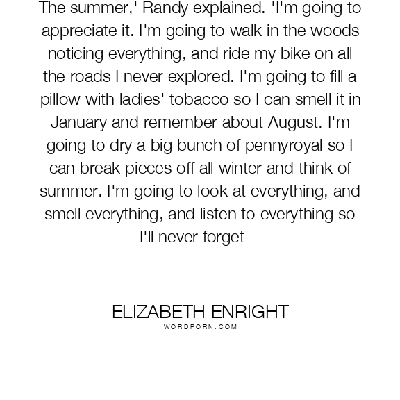 The summer,' Randy explained. 'I'm going to appreciate it. I'm going to walk in the woods noticing everything, and ride my bike on all the roads I never explored. I'm going to fill a pillow with ladies' tobacco so I can smell it in January and remember about August. I'm going to dry a big bunch of pennyroyal so I can break pieces off all winter and think of summer. I'm going to look at everything, and smell everything, and listen to everything so I'll never forget --