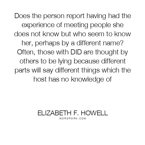 Elizabeth F. Howell quote. Does the person report having had the experience of meeting people she does not know but who seem to know her, perhaps by a different name? Often, those with DID are thought by others to be lying because different parts will say different things which the host has no knowledge of