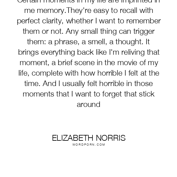 Certain moments in my life are imprinted in me memory.They're easy to recall with perfect clarity, whether I want to remember them or not. Any small thing can trigger them: a phrase, a smell, a thought. It brings everything back like I'm reliving that moment, a brief scene in the movie of my life, complete with how horrible I felt at the time. And I usually felt horrible in those moments that I want to forget that stick around