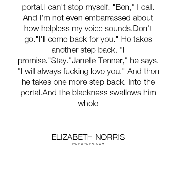 He takes two steps back. Closer to the portal.I can't stop myself. "Ben," I call. And I'm not even embarrassed about how helpless my voice sounds.Don't go."I'll come back for you." He takes another step back. "I promise."Stay."Janelle Tenner," he says. "I will always fucking love you." And then he takes one more step back. Into the portal.And the blackness swallows him whole