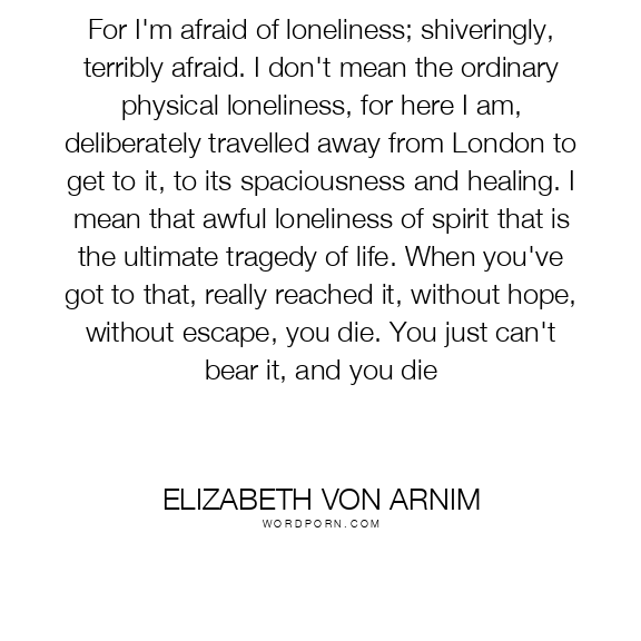 For I'm afraid of loneliness; shiveringly, terribly afraid. I don't mean the ordinary physical loneliness, for here I am, deliberately travelled away from London to get to it, to its spaciousness and healing. I mean that awful loneliness of spirit that is the ultimate tragedy of life. When you've got to that, really reached it, without hope, without escape, you die. You just can't bear it, and you die