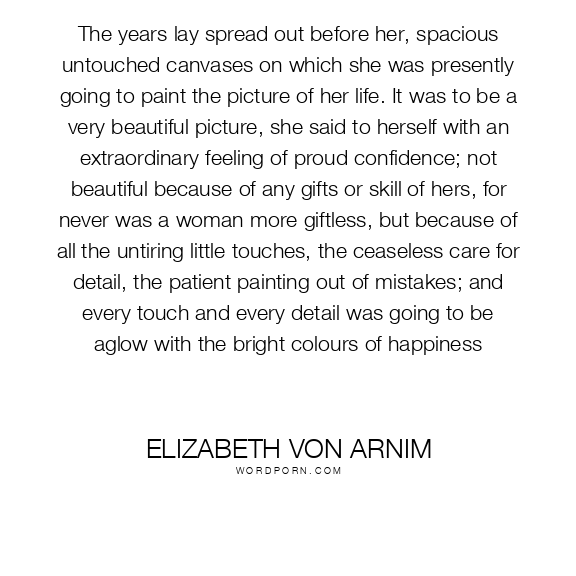 The years lay spread out before her, spacious untouched canvases on which she was presently going to paint the picture of her life. It was to be a very beautiful picture, she said to herself with an extraordinary feeling of proud confidence; not beautiful because of any gifts or skill of hers, for never was a woman more giftless, but because of all the untiring little touches, the ceaseless care for detail, the patient painting out of mistakes; and every touch and every detail was going to be aglow with the bright colours of happiness