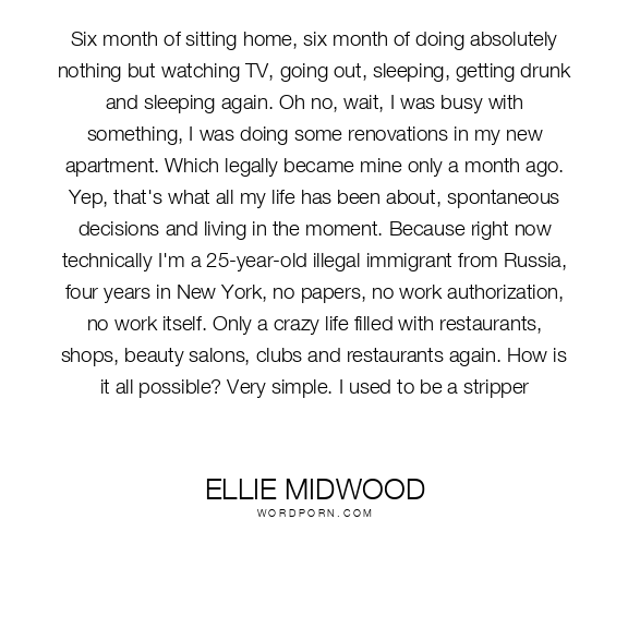 Six month of sitting home, six month of doing absolutely nothing but watching TV, going out, sleeping, getting drunk and sleeping again. Oh no, wait, I was busy with something, I was doing some renovations in my new apartment. Which legally became mine only a month ago. Yep, that's what all my life has been about, spontaneous decisions and living in the moment. Because right now technically I'm a 25-year-old illegal immigrant from Russia, four years in New York, no papers, no work authorization, no work itself. Only a crazy life filled with restaurants, shops, beauty salons, clubs and restaurants again. How is it all possible? Very simple. I used to be a stripper