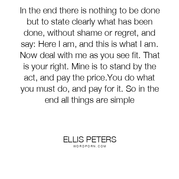In the end there is nothing to be done but to state clearly what has been done, without shame or regret, and say: Here I am, and this is what I am. Now deal with me as you see fit. That is your right. Mine is to stand by the act, and pay the price.You do what you must do, and pay for it. So in the end all things are simple