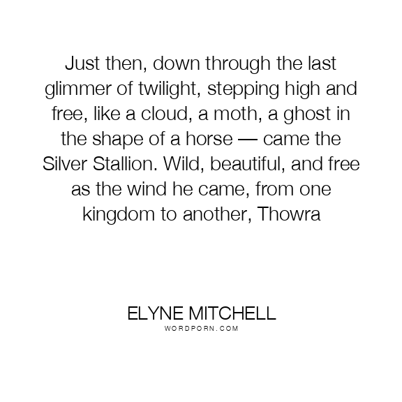 Just then, down through the last glimmer of twilight, stepping high and free, like a cloud, a moth, a ghost in the shape of a horse — came the Silver Stallion. Wild, beautiful, and free as the wind he came, from one kingdom to another, Thowra