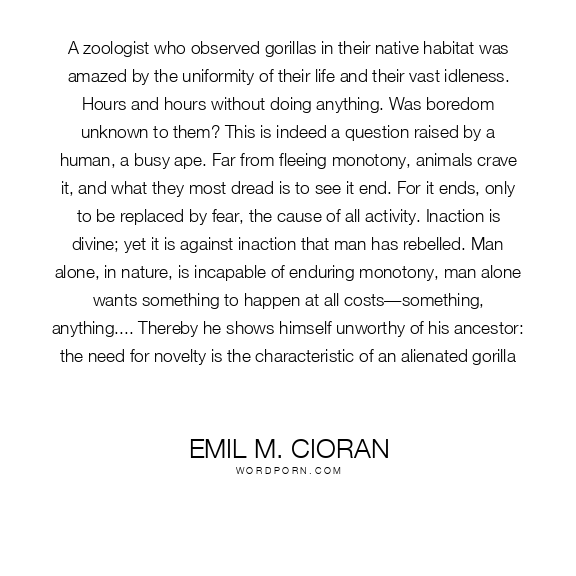 A zoologist who observed gorillas in their native habitat was amazed by the uniformity of their life and their vast idleness. Hours and hours without doing anything. Was boredom unknown to them? This is indeed a question raised by a human, a busy ape. Far from fleeing monotony, animals crave it, and what they most dread is to see it end. For it ends, only to be replaced by fear, the cause of all activity. Inaction is divine; yet it is against inaction that man has rebelled. Man alone, in nature, is incapable of enduring monotony, man alone wants something to happen at all costs—something, anything.... Thereby he shows himself unworthy of his ancestor: the need for novelty is the characteristic of an alienated gorilla