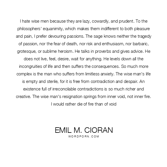 I hate wise men because they are lazy, cowardly, and prudent. To the philosophers' equanimity, which makes them indifferent to both pleasure and pain, I prefer devouring passions. The sage knows neither the tragedy of passion, nor the fear of death, nor risk and enthusiasm, nor barbaric, grotesque, or sublime heroism. He talks in proverbs and gives advice. He does not live, feel, desire, wait for anything. He levels down all the incongruities of life and then suffers the consequences. So much more complex is the man who suffers from limitless anxiety. The wise man's life is empty and sterile, for it is free from contradiction and despair. An existence full of irreconcilable contradictions is so much richer and creative. The wise man's resignation springs from inner void, not inner fire. I would rather die of fire than of void