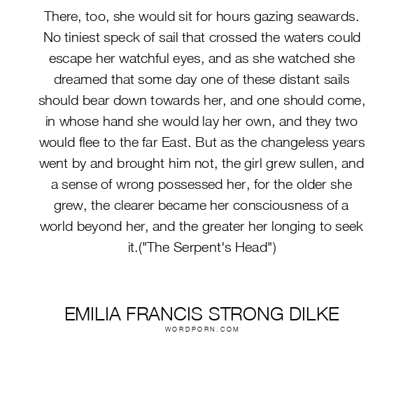 There, too, she would sit for hours gazing seawards. No tiniest speck of sail that crossed the waters could escape her watchful eyes, and as she watched she dreamed that some day one of these distant sails should bear down towards her, and one should come, in whose hand she would lay her own, and they two would flee to the far East. But as the changeless years went by and brought him not, the girl grew sullen, and a sense of wrong possessed her, for the older she grew, the clearer became her consciousness of a world beyond her, and the greater her longing to seek it.("The Serpent's Head")