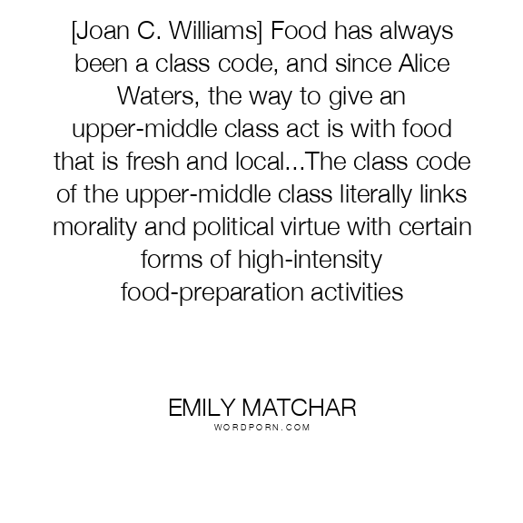 [Joan C. Williams] Food has always been a class code, and since Alice Waters, the way to give an upper-middle class act is with food that is fresh and local...The class code of the upper-middle class literally links morality and political virtue with certain forms of high-intensity food-preparation activities