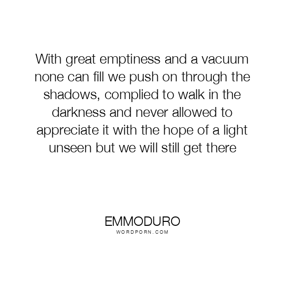 With great emptiness and a vacuum none can fill we push on through the shadows, complied to walk in the darkness and never allowed to appreciate it with the hope of a light unseen but we will still get there