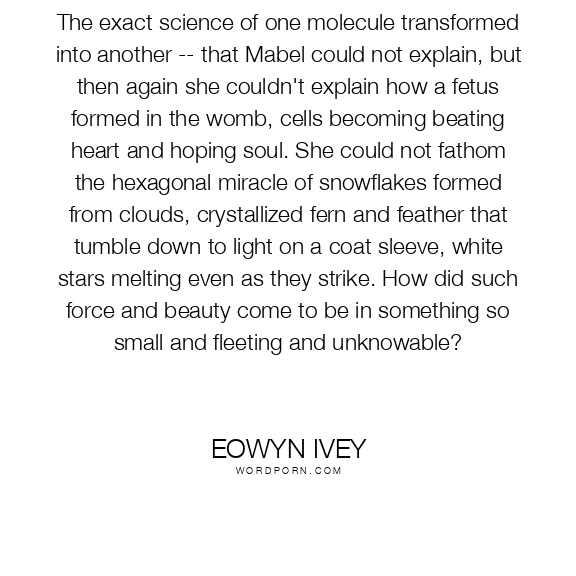 The exact science of one molecule transformed into another -- that Mabel could not explain, but then again she couldn't explain how a fetus formed in the womb, cells becoming beating heart and hoping soul. She could not fathom the hexagonal miracle of snowflakes formed from clouds, crystallized fern and feather that tumble down to light on a coat sleeve, white stars melting even as they strike. How did such force and beauty come to be in something so small and fleeting and unknowable?