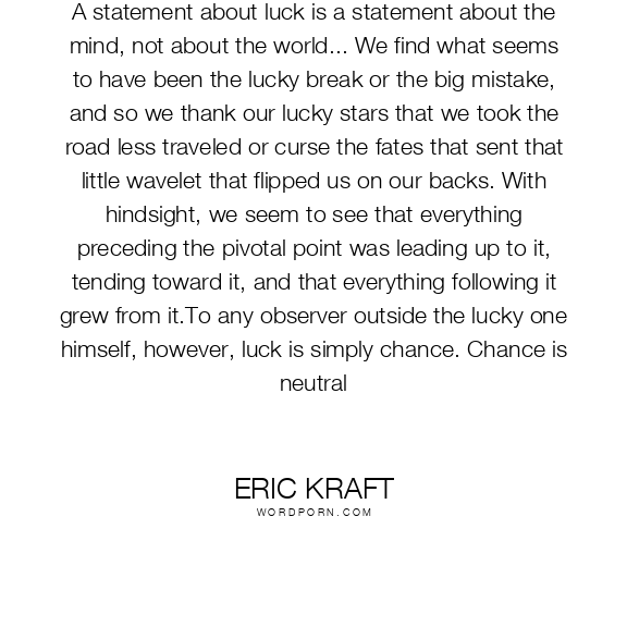A statement about luck is a statement about the mind, not about the world... We find what seems to have been the lucky break or the big mistake, and so we thank our lucky stars that we took the road less traveled or curse the fates that sent that little wavelet that flipped us on our backs. With hindsight, we seem to see that everything preceding the pivotal point was leading up to it, tending toward it, and that everything following it grew from it.To any observer outside the lucky one himself, however, luck is simply chance. Chance is neutral