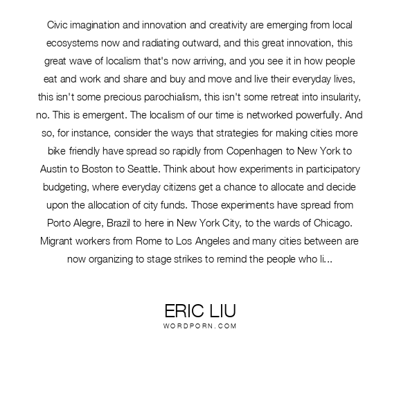 Civic imagination and innovation and creativity are emerging from local ecosystems now and radiating outward, and this great innovation, this great wave of localism that's now arriving, and you see it in how people eat and work and share and buy and move and live their everyday lives, this isn't some precious parochialism, this isn't some retreat into insularity, no. This is emergent. The localism of our time is networked powerfully. And so, for instance, consider the ways that strategies for making cities more bike-friendly have spread so rapidly from Copenhagen to New York to Austin to Boston to Seattle. Think about how experiments in participatory budgeting, where everyday citizens get a chance to allocate and decide upon the allocation of city funds. Those experiments have spread from Porto Alegre, Brazil to here in New York City, to the wards of Chicago. Migrant workers from Rome to Los Angeles and many cities between are now organizing to stage strikes to remind the people who live in their cities what a day without immigrants would look like. In China, all across that country, members of the New Citizens' Movement are beginning to activate and organize to fight official corruption and graft, and they're drawing the ire of officials there, but they're also drawing the attention of anti-corruption activists all around the world. In Seattle, where I'm from, we've become part of a great global array of cities that are now working together bypassing government altogether, national government altogether, in order to try to meet the carbon reduction goals of the Kyoto Protocol. All of these citizens, united, are forming a web, a great archipelago of power that allows us to bypass brokenness and monopolies of control