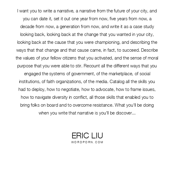 I want you to write a narrative, a narrative from the future of your city, and you can date it, set it out one year from now, five years from now, a decade from now, a generation from now, and write it as a case study looking back, looking back at the change that you wanted in your city, looking back at the cause that you were championing, and describing the ways that that change and that cause came, in fact, to succeed. Describe the values of your fellow citizens that you activated, and the sense of moral purpose that you were able to stir. Recount all the different ways that you engaged the systems of government, of the marketplace, of social institutions, of faith organizations, of the media. Catalog all the skills you had to deploy, how to negotiate, how to advocate, how to frame issues, how to navigate diversity in conflict, all those skills that enabled you to bring folks on board and to overcome resistance. What you'll be doing when you write that narrative is you'll be discovering how to read power, and in the process, how to write power. So share what you write, do you what you write, and then share what you do. [...] Together, we can create a great network of city that will be the most powerful collective laboratory for self-government this planet has ever seen. We have the power to do that
