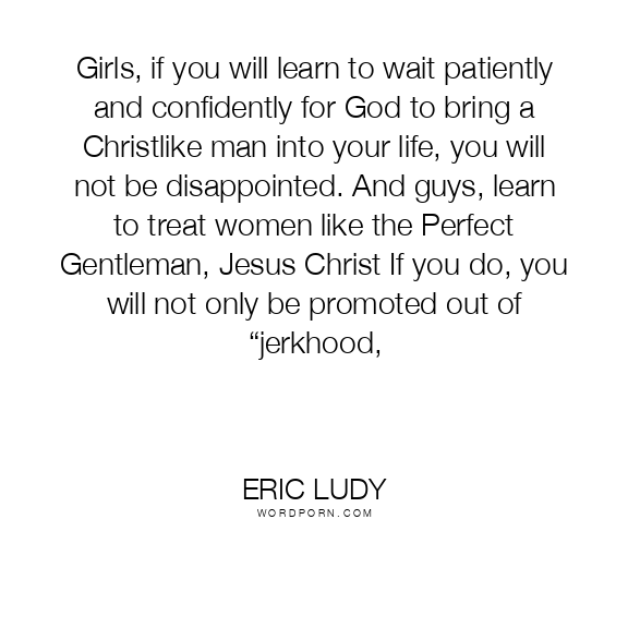 Girls, if you will learn to wait patiently and confidently for God to bring a Christlike man into your life, you will not be disappointed. And guys, learn to treat women like the Perfect Gentleman, Jesus Christ If you do, you will not only be promoted out of “jerkhood,