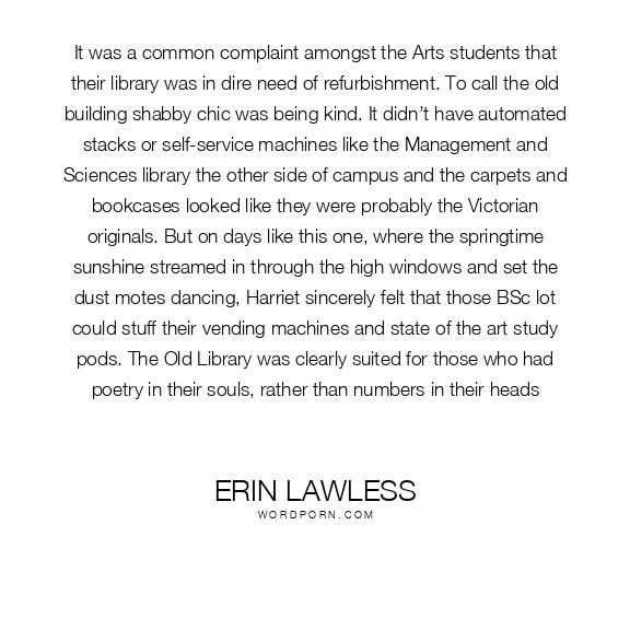 It was a common complaint amongst the Arts students that their library was in dire need of refurbishment. To call the old building shabby chic was being kind. It didn’t have automated stacks or self-service machines like the Management and Sciences library the other side of campus and the carpets and bookcases looked like they were probably the Victorian originals. But on days like this one, where the springtime sunshine streamed in through the high windows and set the dust motes dancing, Harriet sincerely felt that those BSc lot could stuff their vending machines and state of the art study pods. The Old Library was clearly suited for those who had poetry in their souls, rather than numbers in their heads