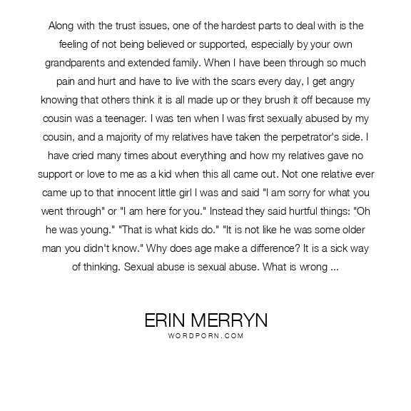 Erin Merryn quote. Along with the trust issues, one of the hardest parts to deal with is the feeling of not being believed or supported, especially by your own grandparents and extended family. When I have been through so much pain and hurt and have to live with the scars every day, I get angry knowing that others think it is all made up or they brush it off because my cousin was a teenager. I was ten when I was first sexually abused by my cousin, and a majority of my relatives have taken the perpetrator's side. I have cried many times about everything and how my relatives gave no support or love to me as a kid when this all came out. Not one relative ever came up to that innocent little girl I was and said