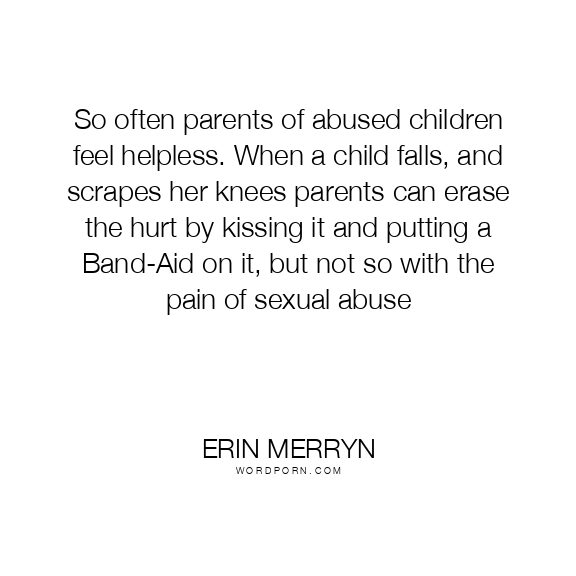 Erin Merryn quote. So often parents of abused children feel helpless. When a child falls, and scrapes her knees parents can erase the hurt by kissing it and putting a Band-Aid on it, but not so with the pain of sexual abuse