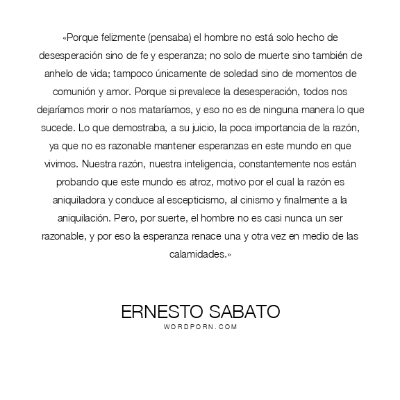 «Porque felizmente (pensaba) el hombre no está solo hecho de desesperación sino de fe y esperanza; no solo de muerte sino también de anhelo de vida; tampoco únicamente de soledad sino de momentos de comunión y amor. Porque si prevalece la desesperación, todos nos dejaríamos morir o nos mataríamos, y eso no es de ninguna manera lo que sucede. Lo que demostraba, a su juicio, la poca importancia de la razón, ya que no es razonable mantener esperanzas en este mundo en que vivimos. Nuestra razón, nuestra inteligencia, constantemente nos están probando que este mundo es atroz, motivo por el cual la razón es aniquiladora y conduce al escepticismo, al cinismo y finalmente a la aniquilación. Pero, por suerte, el hombre no es casi nunca un ser razonable, y por eso la esperanza renace una y otra vez en medio de las calamidades.»