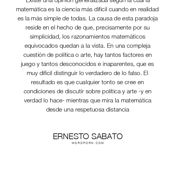 Existe una opinión generalizada según la cual la matemática es la ciencia más difícil cuando en realidad es la más simple de todas. La causa de esta paradoja reside en el hecho de que, precisamente por su simplicidad, los razonamientos matemáticos equivocados quedan a la vista. En una compleja cuestión de política o arte, hay tantos factores en juego y tantos desconocidos e inaparentes, que es muy difícil distinguir lo verdadero de lo falso. El resultado es que cualquier tonto se cree en condiciones de discutir sobre política y arte -y en verdad lo hace- mientras que mira la matemática desde una respetuosa distancia