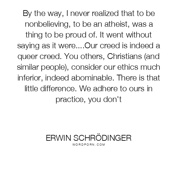 By the way, I never realized that to be nonbelieving, to be an atheist, was a thing to be proud of. It went without saying as it were....Our creed is indeed a queer creed. You others, Christians (and similar people), consider our ethics much inferior, indeed abominable. There is that little difference. We adhere to ours in practice, you don't