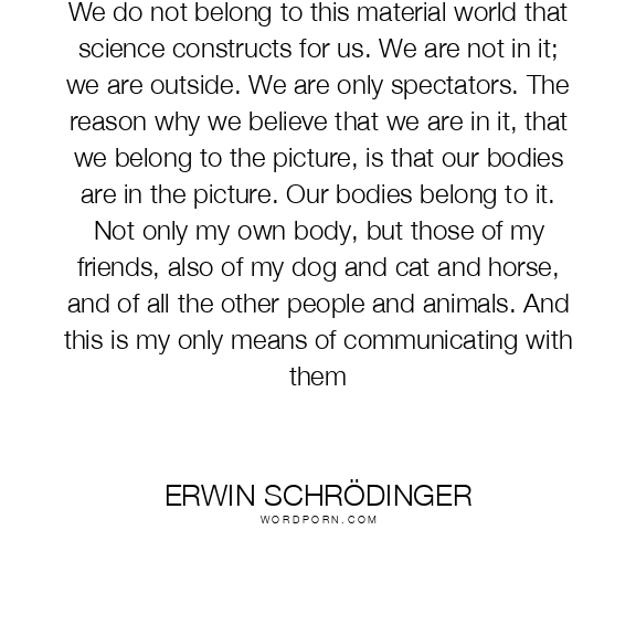 We do not belong to this material world that science constructs for us. We are not in it; we are outside. We are only spectators. The reason why we believe that we are in it, that we belong to the picture, is that our bodies are in the picture. Our bodies belong to it. Not only my own body, but those of my friends, also of my dog and cat and horse, and of all the other people and animals. And this is my only means of communicating with them