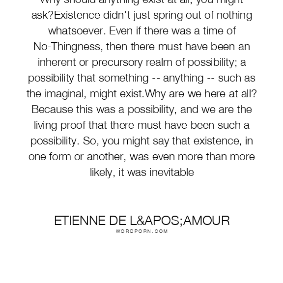 Why should anything exist at all, you might ask?Existence didn't just spring out of nothing whatsoever. Even if there was a time of No-Thingness, then there must have been an inherent or precursory realm of possibility; a possibility that something -- anything -- such as the imaginal, might exist.Why are we here at all? Because this was a possibility, and we are the living proof that there must have been such a possibility. So, you might say that existence, in one form or another, was even more than more likely, it was inevitable