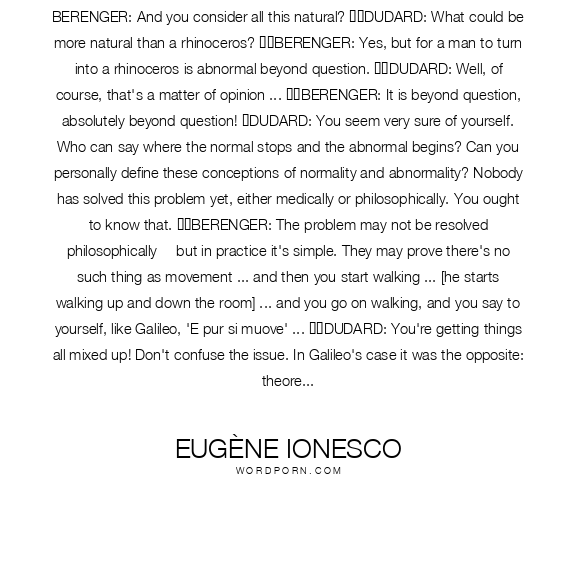 BERENGER: And you consider all this natural? DUDARD: What could be more natural than a rhinoceros? BERENGER: Yes, but for a man to turn into a rhinoceros is abnormal beyond question. DUDARD: Well, of course, that's a matter of opinion ... BERENGER: It is beyond question, absolutely beyond question! DUDARD: You seem very sure of yourself. Who can say where the normal stops and the abnormal begins? Can you personally define these conceptions of normality and abnormality? Nobody has solved this problem yet, either medically or philosophically. You ought to know that. BERENGER: The problem may not be resolved philosophically -- but in practice it's simple. They may prove there's no such thing as movement ... and then you start walking ... [he starts walking up and down the room] ... and you go on walking, and you say to yourself, like Galileo, 'E pur si muove' ... DUDARD: You're getting things all mixed up! Don't confuse the issue. In Galileo's case it was the opposite: theoretic and scientific thought proving itself superior to mass opinion and dogmatism. BERENGER: [quite lost] What does all that mean? Mass opinion, dogmatism -- they're just words! I may be mixing everything up in my head but you're losing yours. You don't know what's normal and what isn't any more. I couldn't care less about Galileo ... I don't give a damn about Galileo. DUDARD: You brought him up in the first place and raised the whole question, saying that practice always had the last word. Maybe it does, but only when it proceeds from theory! The history of thought and science proves that. BERENGER: [more and more furious] It doesn't prove anything of the sort! It's all gibberish, utter lunacy! DUDARD: There again we need to define exactly what we mean by lunacy ... BERENGER: Lunacy is lunacy and that's all there is to it! Everybody knows what lunacy is. And what about the rhinoceroses -- are they practice or are they theory?