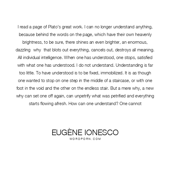 I read a page of Plato's great work. I can no longer understand anything, because behind the words on the page, which have their own heavenly brightness, to be sure, there shines an even brighter, an enormous, dazzling -why- that blots out everything, cancels out, destroys all meaning. All individual intelligence. When one has understood, one stops, satisfied with what one has understood. I do not understand. Understanding is far too little. To have understood is to be fixed, immobilized. It is as though one wanted to stop on one step in the middle of a staircase, or with one foot in the void and the other on the endless stair. But a mere why, a new why can set one off again, can unpetrify what was petrified and everything starts flowing afresh. How can one understand? One cannot