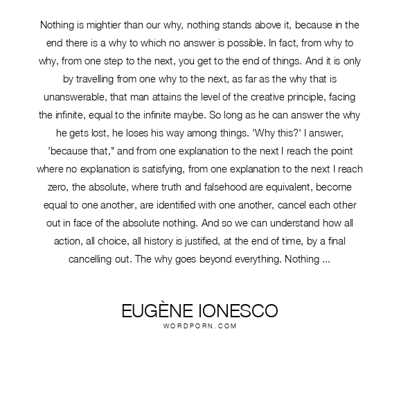 Nothing is mightier than our why, nothing stands above it, because in the end there is a why to which no answer is possible. In fact, from why to why, from one step to the next, you get to the end of things. And it is only by travelling from one why to the next, as far as the why that is unanswerable, that man attains the level of the creative principle, facing the infinite, equal to the infinite maybe. So long as he can answer the why he gets lost, he loses his way among things. 'Why this?' I answer, 'because that," and from one explanation to the next I reach the point where no explanation is satisfying, from one explanation to the next I reach zero, the absolute, where truth and falsehood are equivalent, become equal to one another, are identified with one another, cancel each other out in face of the absolute nothing. And so we can understand how all action, all choice, all history is justified, at the end of time, by a final cancelling-out. The why goes beyond everything. Nothing goes beyond the why, not even the nothing, because the nothing is not the explanation; when silence confronts us, the question to which there is no answer rings out in the silence. That ultimate why, that great why is like a light that blots out everything, but a blinding light; nothing more can be made out, there is nothing more to make out
