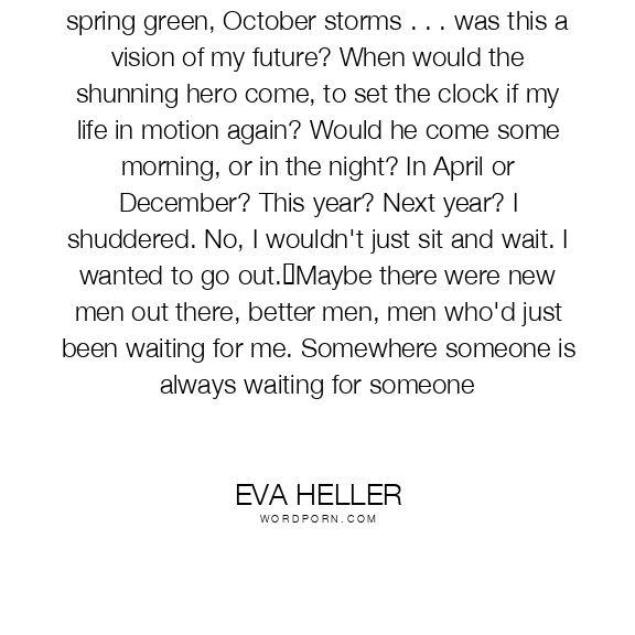 Outside the seasons passed: sun, snow, spring green, October storms . . . was this a vision of my future? When would the shunning hero come, to set the clock if my life in motion again? Would he come some morning, or in the night? In April or December? This year? Next year? I shuddered. No, I wouldn't just sit and wait. I wanted to go out. Maybe there were new men out there, better men, men who'd just been waiting for me. Somewhere someone is always waiting for someone