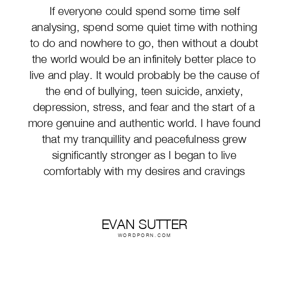 If everyone could spend some time self analysing, spend some quiet time with nothing to do and nowhere to go, then without a doubt the world would be an infinitely better place to live and play. It would probably be the cause of the end of bullying, teen suicide, anxiety, depression, stress, and fear and the start of a more genuine and authentic world. I have found that my tranquillity and peacefulness grew significantly stronger as I began to live comfortably with my desires and cravings