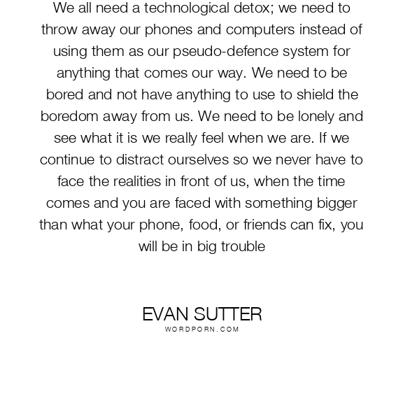 We all need a technological detox; we need to throw away our phones and computers instead of using them as our pseudo-defence system for anything that comes our way. We need to be bored and not have anything to use to shield the boredom away from us. We need to be lonely and see what it is we really feel when we are. If we continue to distract ourselves so we never have to face the realities in front of us, when the time comes and you are faced with something bigger than what your phone, food, or friends can fix, you will be in big trouble