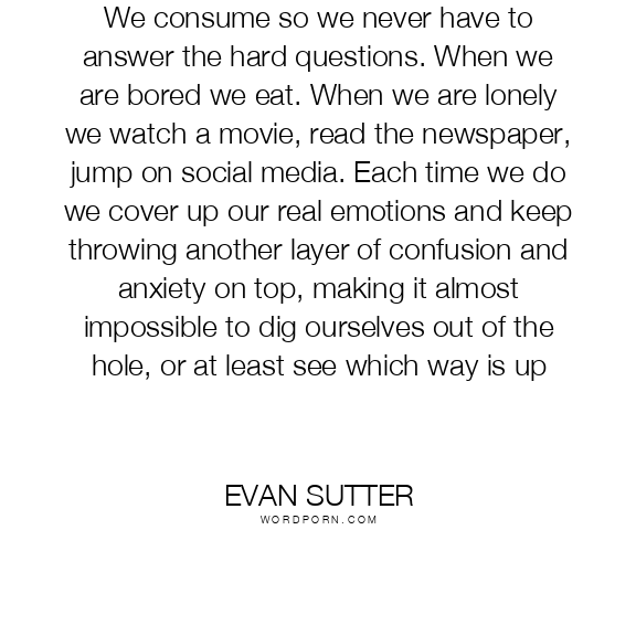 We consume so we never have to answer the hard questions. When we are bored we eat. When we are lonely we watch a movie, read the newspaper, jump on social media. Each time we do we cover up our real emotions and keep throwing another layer of confusion and anxiety on top, making it almost impossible to dig ourselves out of the hole, or at least see which way is up