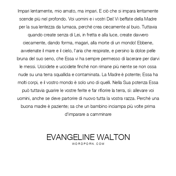 Impari lentamente, mio amato, ma impari. E ciò che si impara lentamente scende più nel profondo. Voi uomini e i vostri Dei! Vi beffate della Madre per la sua lentezza da lumaca, perché crea ciecamente al buio. Tuttavia quando create senza di Lei, in fretta e alla luce, create davvero ciecamente, dando forma, magari, alla morte di un mondo! Ebbene, avvelenate il mare e il cielo, l'aria che respirate, e persino la dolce pelle bruna del suo seno, che Essa vi ha sempre permesso di lacerare per darvi le messi. Uccidete e uccidete finché non rimane più niente se non ossa nude su una terra squallida e contaminata. La Madre è potente; Essa ha molti corpi, e il vostro mondo è solo uno di quelli. Nella Sua potenza Essa può tuttavia guarire le vostre ferite e far rifiorire la terra, sì: allevare voi uomini, anche se deve partorire di nuovo tutta la vostra razza. Perché una buona madre è paziente; sa che un bambino inciampa più volte prima d'imparare a camminare