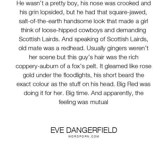 He wasn’t a pretty boy, his nose was crooked and his grin lopsided, but he had that square-jawed, salt-of-the-earth handsome look that made a girl think of loose-hipped cowboys and demanding Scottish Lairds. And speaking of Scottish Lairds, old mate was a redhead. Usually gingers weren’t her scene but this guy’s hair was the rich coppery-auburn of a fox's pelt. It gleamed like rose gold under the floodlights, his short beard the exact colour as the stuff on his head. Big Red was doing it for her. Big time. And apparently, the feeling was mutual