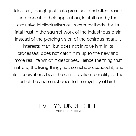 Idealism, though just in its premises, and often daring and honest in their application, is stultified by the exclusive intellectualism of its own methods: by its fatal trust in the squirrel-work of the industrious brain instead of the piercing vision of the desirous heart. It interests man, but does not involve him in its processes: does not catch him up to the new and more real life which it describes. Hence the thing that matters, the living thing, has somehow escaped it; and its observations bear the same relation to reality as the art of the anatomist does to the mystery of birth