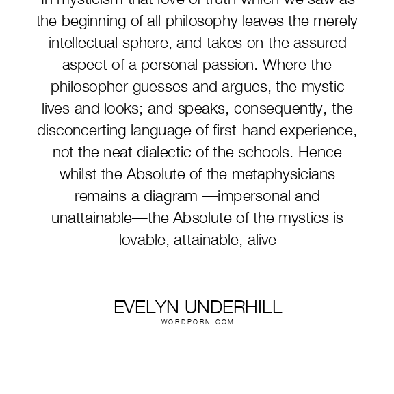 In mysticism that love of truth which we saw as the beginning of all philosophy leaves the merely intellectual sphere, and takes on the assured aspect of a personal passion. Where the philosopher guesses and argues, the mystic lives and looks; and speaks, consequently, the disconcerting language of first-hand experience, not the neat dialectic of the schools. Hence whilst the Absolute of the metaphysicians remains a diagram —impersonal and unattainable—the Absolute of the mystics is lovable, attainable, alive