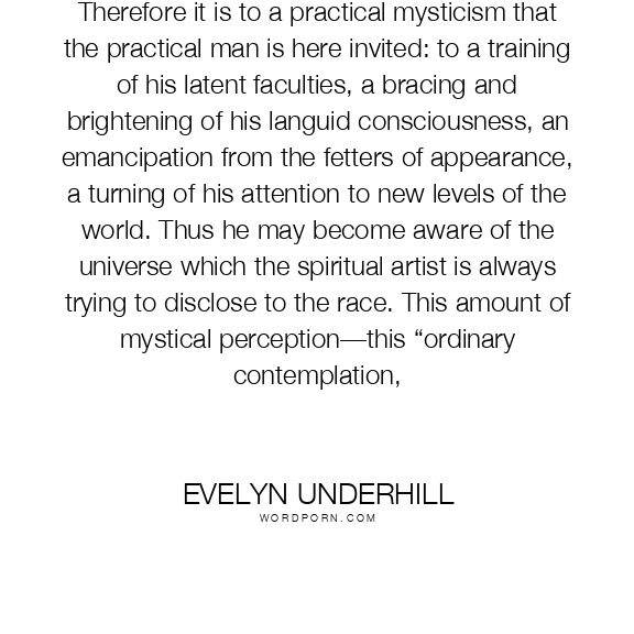 Therefore it is to a practical mysticism that the practical man is here invited: to a training of his latent faculties, a bracing and brightening of his languid consciousness, an emancipation from the fetters of appearance, a turning of his attention to new levels of the world. Thus he may become aware of the universe which the spiritual artist is always trying to disclose to the race. This amount of mystical perception—this “ordinary contemplation,