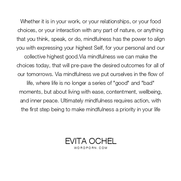 Whether it is in your work, or your relationships, or your food choices, or your interaction with any part of nature, or anything that you think, speak, or do, mindfulness has the power to align you with expressing your highest Self, for your personal and our collective highest good.Via mindfulness we can make the choices today, that will pre-pave the desired outcomes for all of our tomorrows. Via mindfulness we put ourselves in the flow of life, where life is no longer a series of "good" and "bad" moments, but about living with ease, contentment, wellbeing, and inner peace. Ultimately mindfulness requires action, with the first step being to make mindfulness a priority in your life