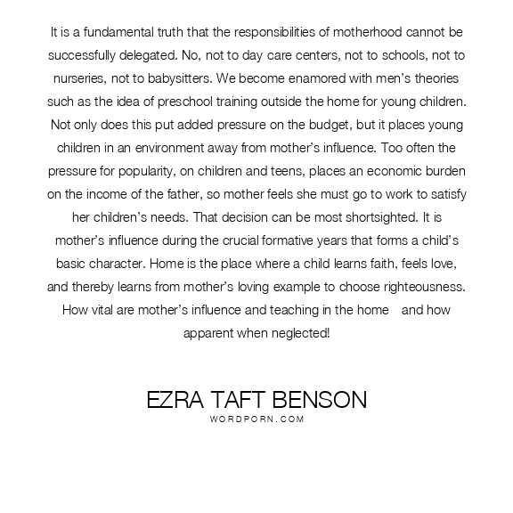 It is a fundamental truth that the responsibilities of motherhood cannot be successfully delegated. No, not to day-care centers, not to schools, not to nurseries, not to babysitters. We become enamored with men’s theories such as the idea of preschool training outside the home for young children. Not only does this put added pressure on the budget, but it places young children in an environment away from mother’s influence. Too often the pressure for popularity, on children and teens, places an economic burden on the income of the father, so mother feels she must go to work to satisfy her children’s needs. That decision can be most shortsighted. It is mother’s influence during the crucial formative years that forms a child’s basic character. Home is the place where a child learns faith, feels love, and thereby learns from mother’s loving example to choose righteousness. How vital are mother’s influence and teaching in the home—and how apparent when neglected!