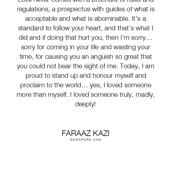 Love never comes with a brochure of rules and regulations, a prospectus with guides of what is acceptable and what is abominable. It’s a standard to follow your heart, and that’s what I did and if doing that hurt you, then I’m sorry… sorry for coming in your life and wasting your time, for causing you an anguish so great that you could not bear the sight of me. Today, I am proud to stand up and honour myself and proclaim to the world… yes, I loved someone more than myself. I loved someone truly, madly, deeply!