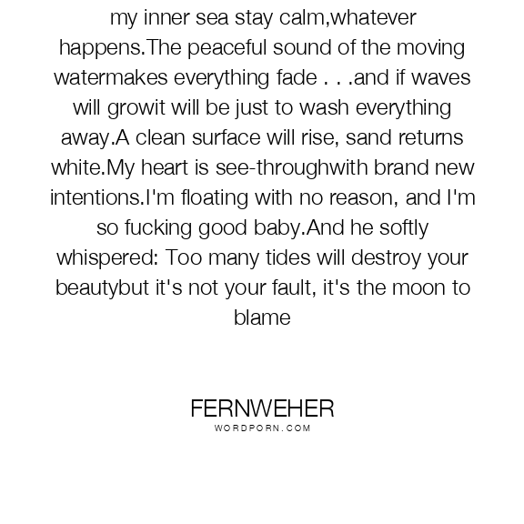 You’re throwing stonesacross my waterbut my inner sea stay calm,whatever happens.The peaceful sound of the moving watermakes everything fade . . .and if waves will growit will be just to wash everything away.A clean surface will rise, sand returns white.My heart is see-throughwith brand new intentions.I'm floating with no reason, and I'm so fucking good baby.And he softly whispered: Too many tides will destroy your beautybut it's not your fault, it's the moon to blame
