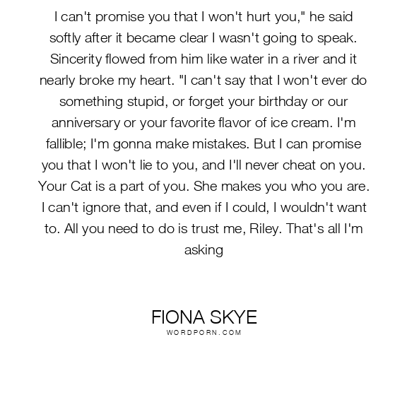 I can't promise you that I won't hurt you," he said softly after it became clear I wasn't going to speak. Sincerity flowed from him like water in a river and it nearly broke my heart. "I can't say that I won't ever do something stupid, or forget your birthday or our anniversary or your favorite flavor of ice cream. I'm fallible; I'm gonna make mistakes. But I can promise you that I won't lie to you, and I'll never cheat on you. Your Cat is a part of you. She makes you who you are. I can't ignore that, and even if I could, I wouldn't want to. All you need to do is trust me, Riley. That's all I'm asking
