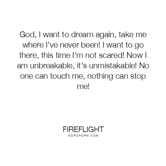 God, I want to dream again, take me where I've never been! I want to go there, this time I'm not scared! Now I am unbreakable, it's unmistakable! No one can touch me, nothing can stop me!