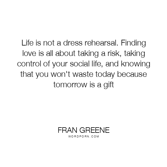 Life is not a dress rehearsal. Finding love is all about taking a risk, taking control of your social life, and knowing that you won't waste today because tomorrow is a gift