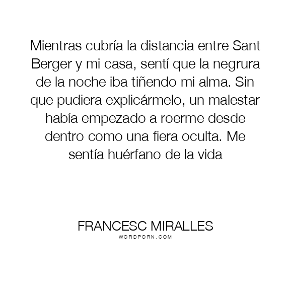 Mientras cubría la distancia entre Sant Berger y mi casa, sentí que la negrura de la noche iba tiñendo mi alma. Sin que pudiera explicármelo, un malestar había empezado a roerme desde dentro como una fiera oculta. Me sentía huérfano de la vida