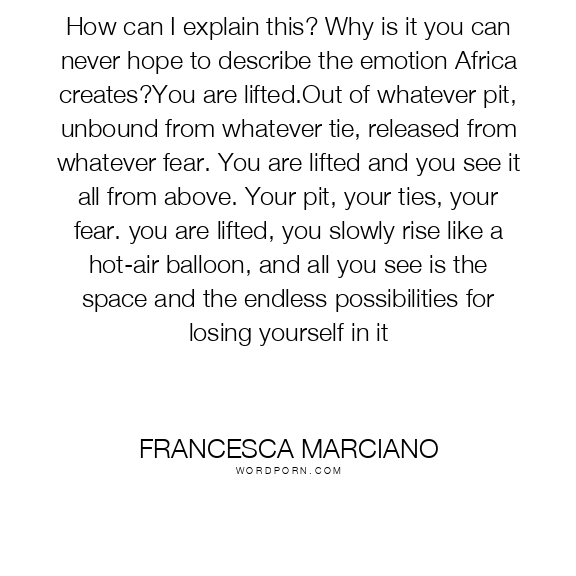 How can I explain this? Why is it you can never hope to describe the emotion Africa creates?You are lifted.Out of whatever pit, unbound from whatever tie, released from whatever fear. You are lifted and you see it all from above. Your pit, your ties, your fear. you are lifted, you slowly rise like a hot-air balloon, and all you see is the space and the endless possibilities for losing yourself in it
